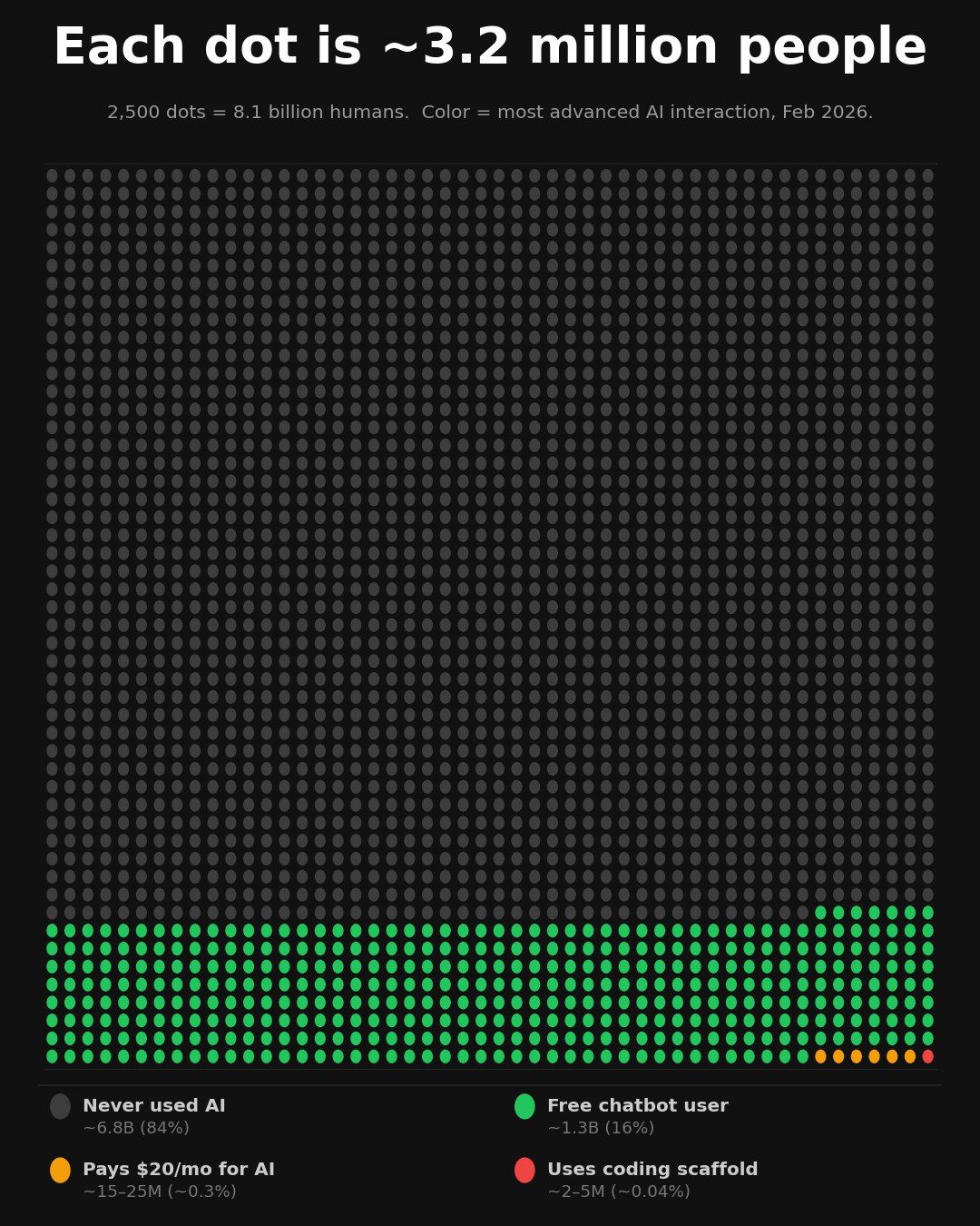 Only 16% have used a free chatbot. 0.3% pay for AI. And a minuscule 0.04%, basically nobody, uses the really advanced stuff.